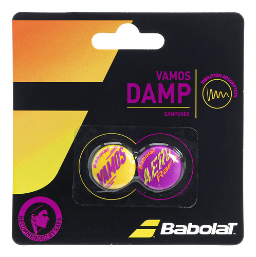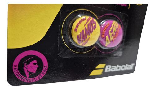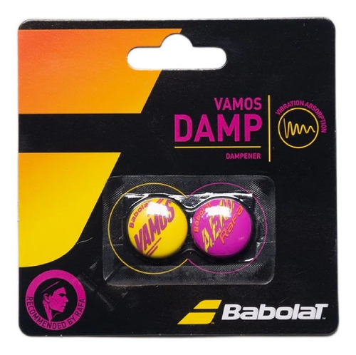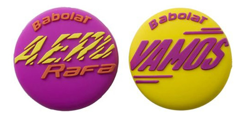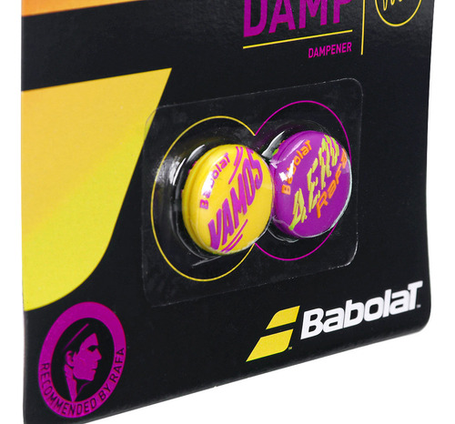 Babolat es una empresa francesa de equipamiento para tenis, pádel, bádminton y squash. Con una rica historia de innovación y tecnología avanzada, la marca ofrece productos que han impulsado a generaciones de campeones que han ganado los torneos más prestigiosos del planeta. Es conocida por la producción de raquetas utilizadas por atletas de renombre como Rafael Nadal y Carlos Alcaraz. El antivibrador, o amortiguador, es un equipo muy utilizado en el mundo del tenis y sirve para reducir las vibraciones y los ruidos producidos por el contacto de la pelota con la cuerda de la raqueta. El antivibrador hay que cambiarlo cada cierto tiempo para que no pierda su verdadero significado, ya que cuando pierde elasticidad o la capacidad de sujetarse firmemente a las cuerdas, puede ser que tanto este como las cuerdas vibren más. Además, con el tiempo pierde su efecto silenciador. El antivibrador Babolat Vamos Damp Rafa tiene un diseño redondeado y una escritura estilizada, una en amarillo y la otra en morado, ¡que aporta más alegría y bienestar en la pista!