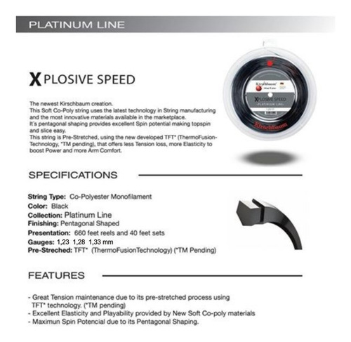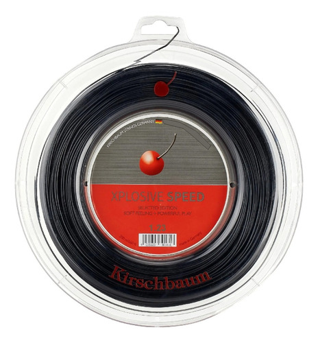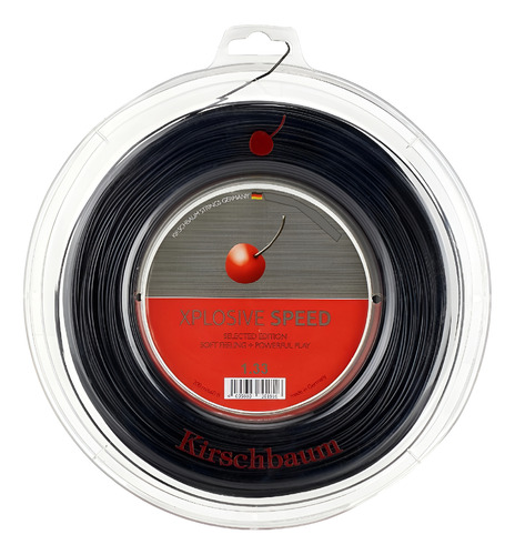 La cuerda KIRSCHBAUM XPLOSIVE SPEED es un monofilamento de color negro realizado en copoliéster, muy confortable y con un gran potencial para la aplicación de efectos como el topspin y el slice. Con su agarre de perfil de cinco lados, el Xplosive Speed sujeta firmemente la pelota, lo que facilita que las cuerdas agarren y carguen la pelota con gran giro. Está diseñada con agentes suavizantes. Esta cuerda tiene una comodidad superior a la media para un monofilamento a base de poliester. La cuerda Kirschbaum pre-estira Xplosive Speed utilizando su tecnología ThermoFusion. El resultado, según nuestro equipo de prueba, es una jugabilidad más duradera. En resumen: es una gran opción para cualquier jugador que quiera durabilidad, efectos y control sin tener que sacrificar la comodidad.